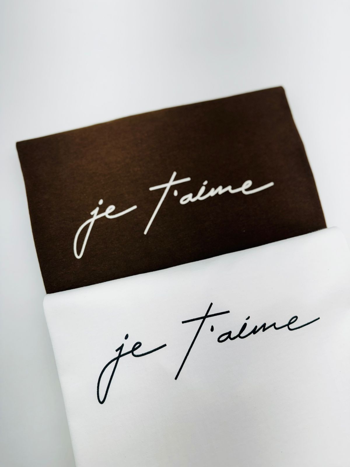 A clássica T-shirt branca ou marrom ganha um toque francês com a estampa “Je T’aime” – perfeita para compor looks minimalistas, modernos e cheios de charme!