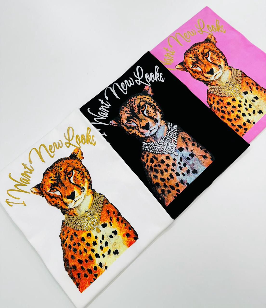 • Estampa: Ilustração de guepardo com colar de pedras preciosas (estampa em foil dourado) e frase “I Want New Looks”